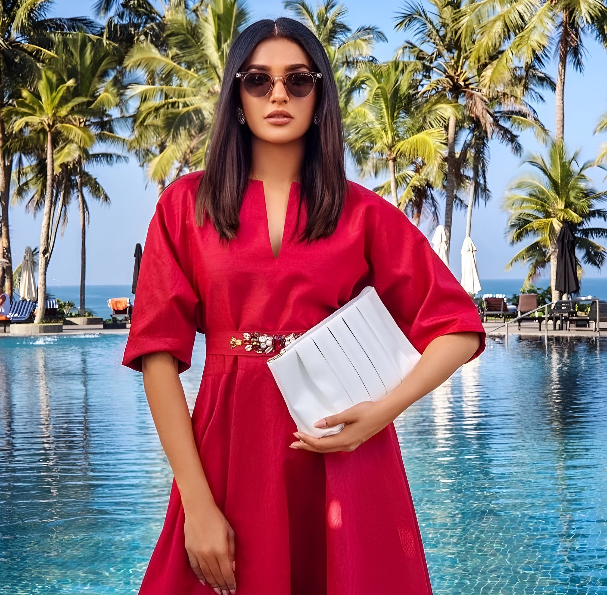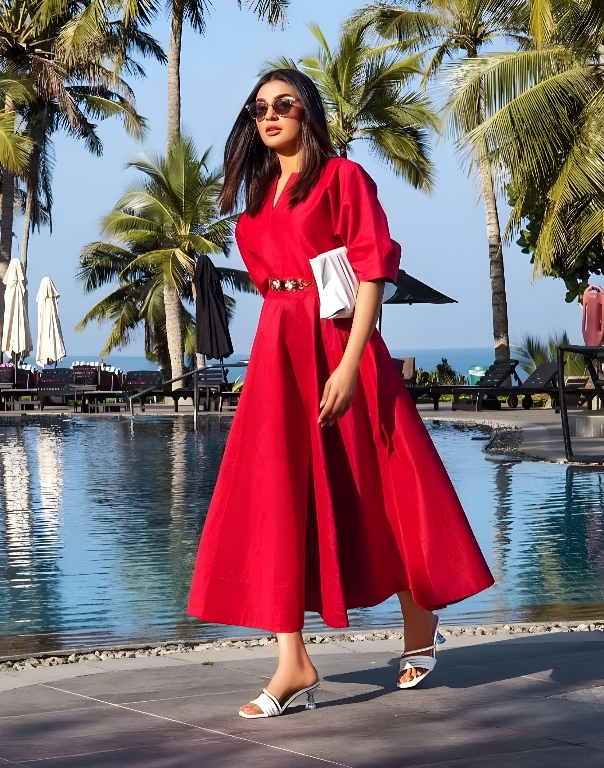 Make an effortlessly bold statement in this elegant red dress, tailored from fused Korean silk fabric for a lustrous, structured finish. The look is elevated with a detachable embellished belt, intricately adorned with delicate stone work that cinches the waist for a flattering silhouette.
