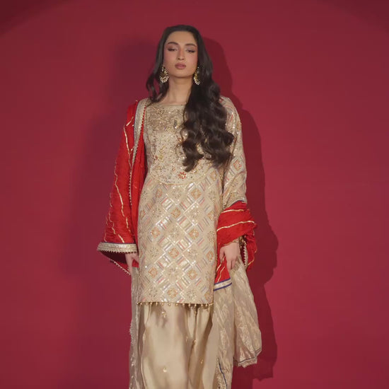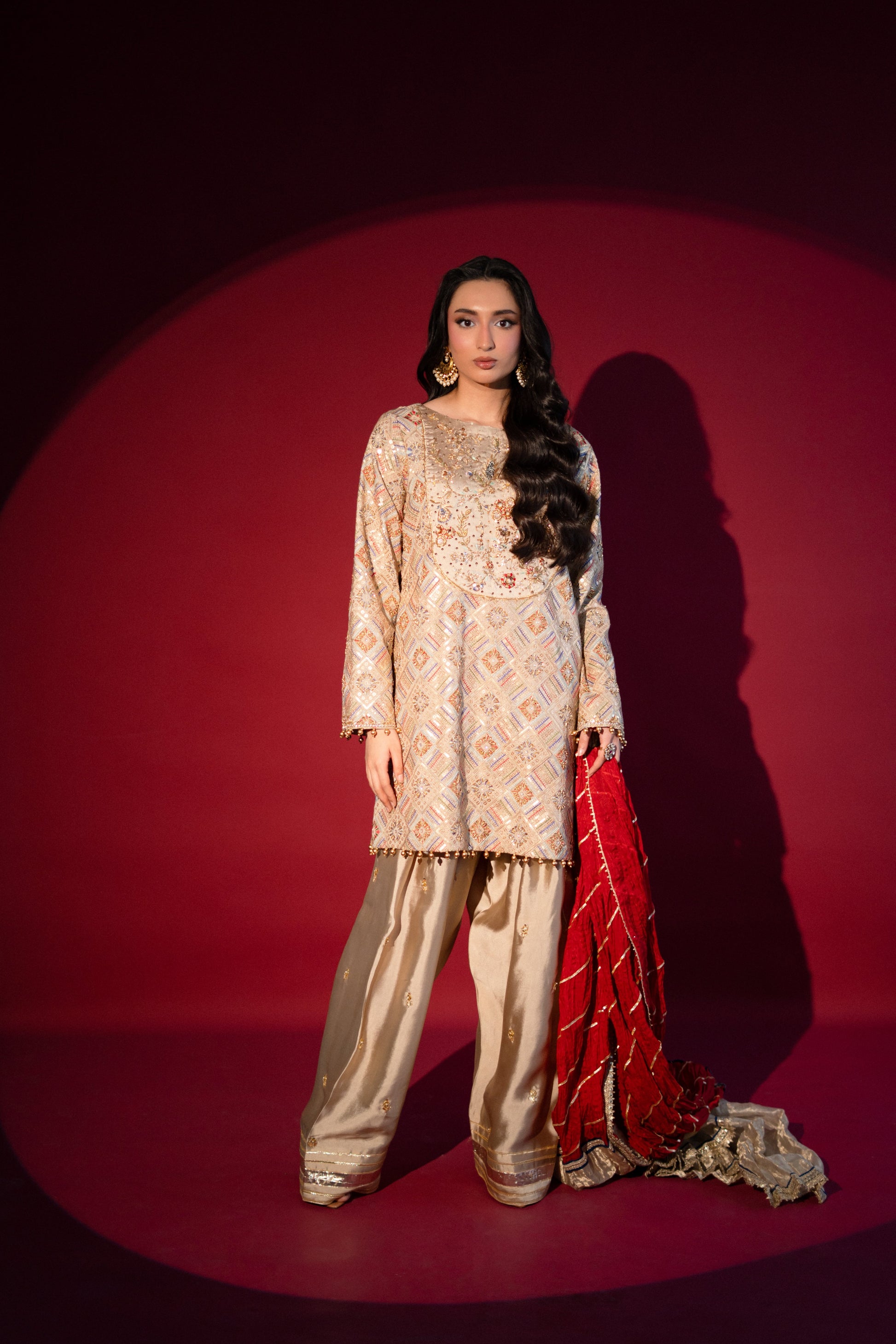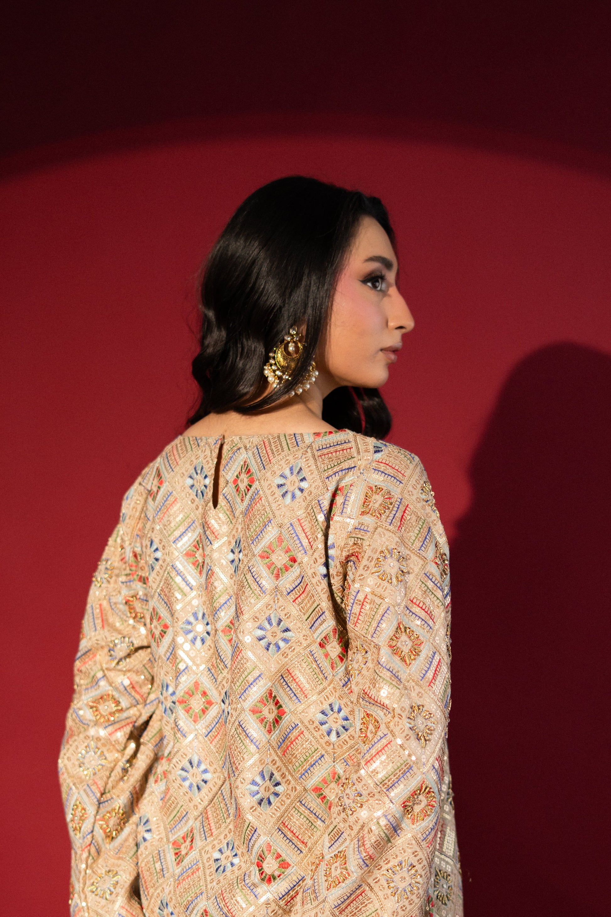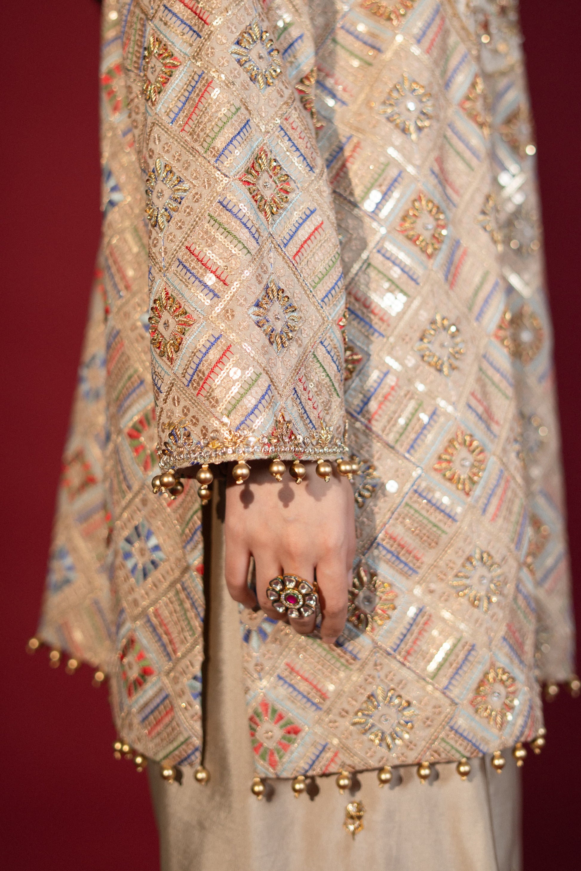 This elegant ensemble is crafted from soft self-embroidered fabric, featuring a beautifully hand-worked neckline patch and intricate hand embellishments all over the shirt, adding a luxurious and detailed finish to the look.