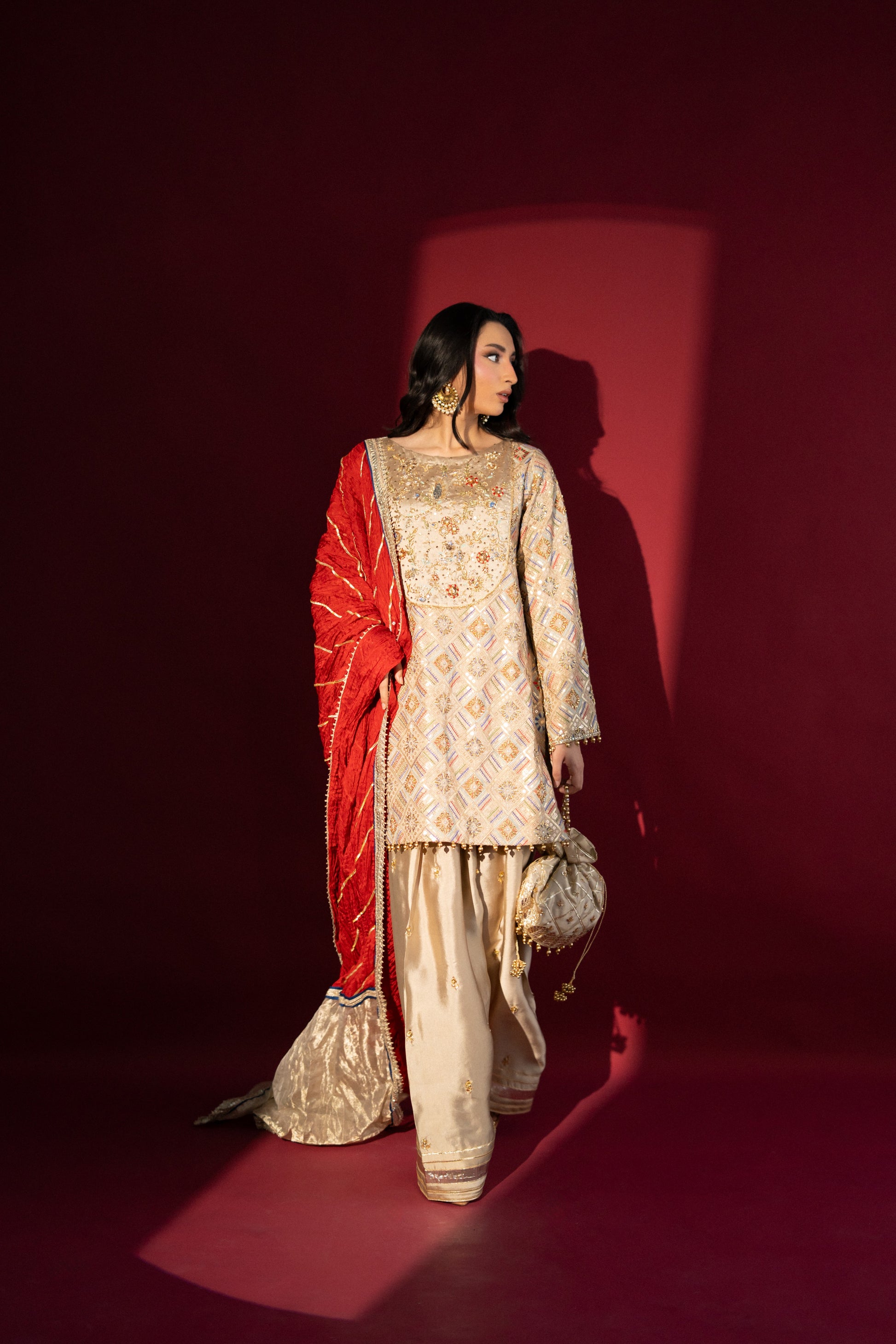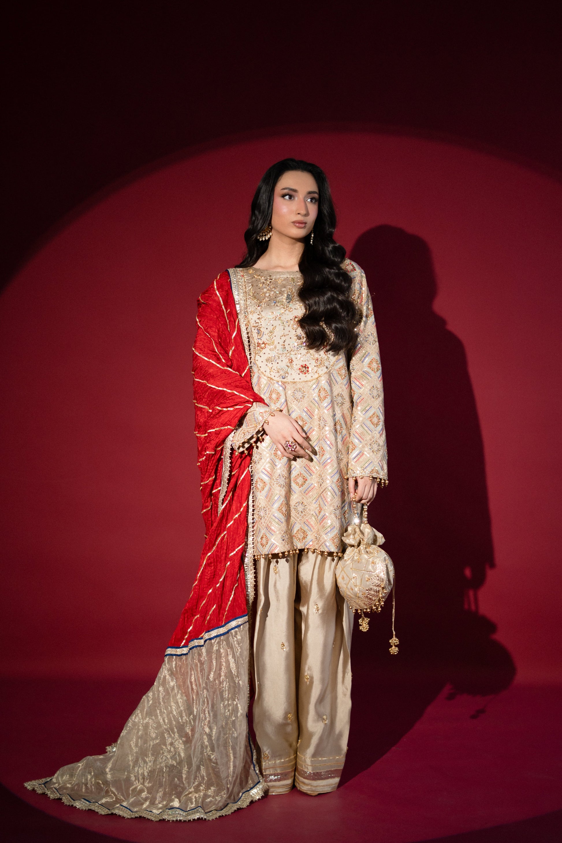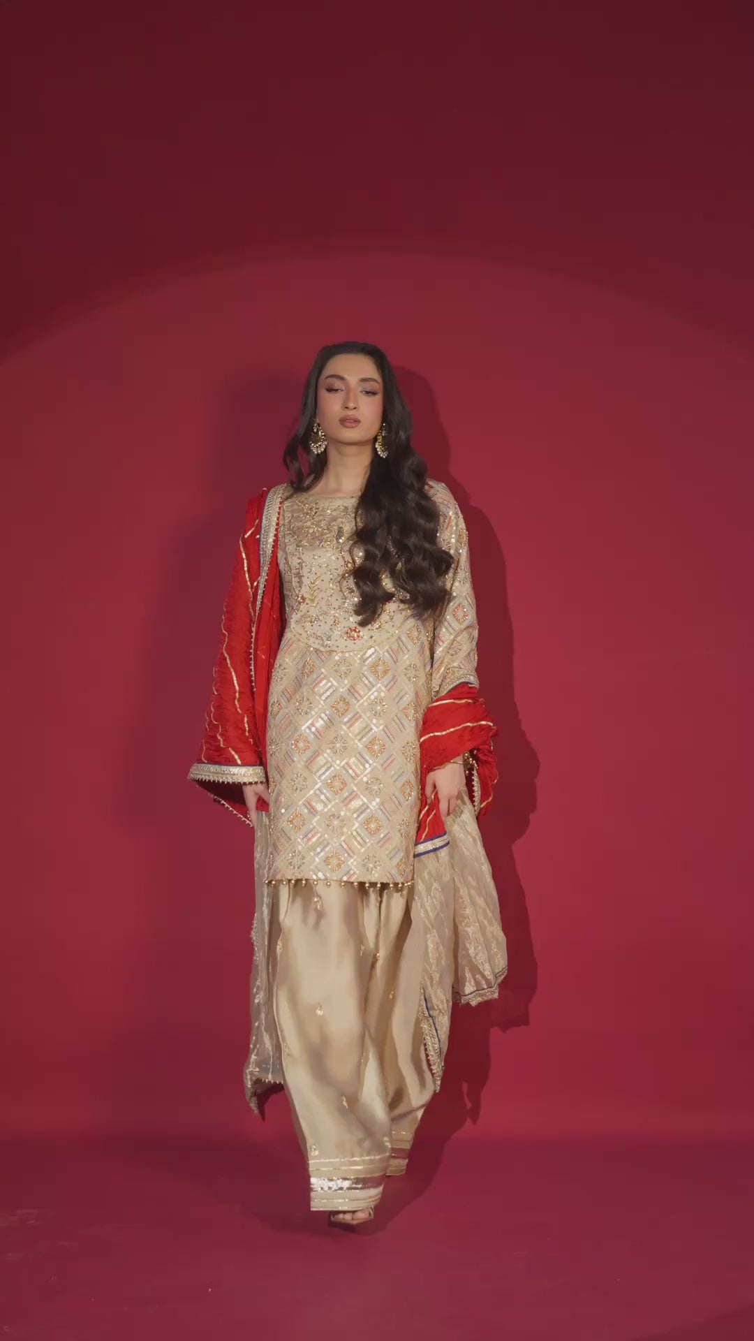 To add a vibrant festive pop, the ensemble is paired with a crushed red medium-silk dupatta, finished with a gold lame’ pallu. A striking blue patch adds contrast and dimension, while delicate lace details refine the overall look.
