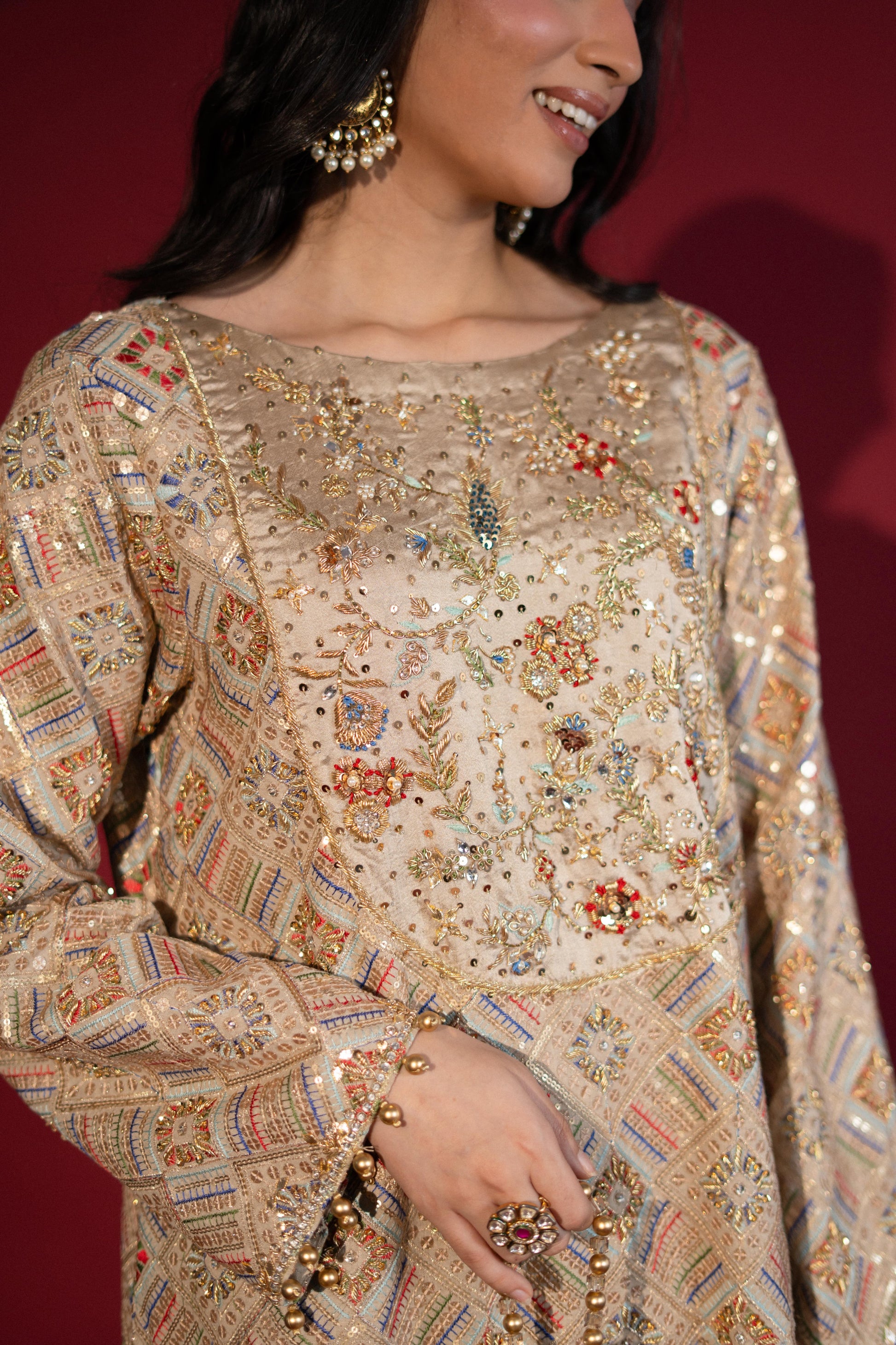 The outfit includes a classic Sheesha Silk Farshi Shalwar, enhanced with hand work and lace detailing, giving it a rich, traditional drape.